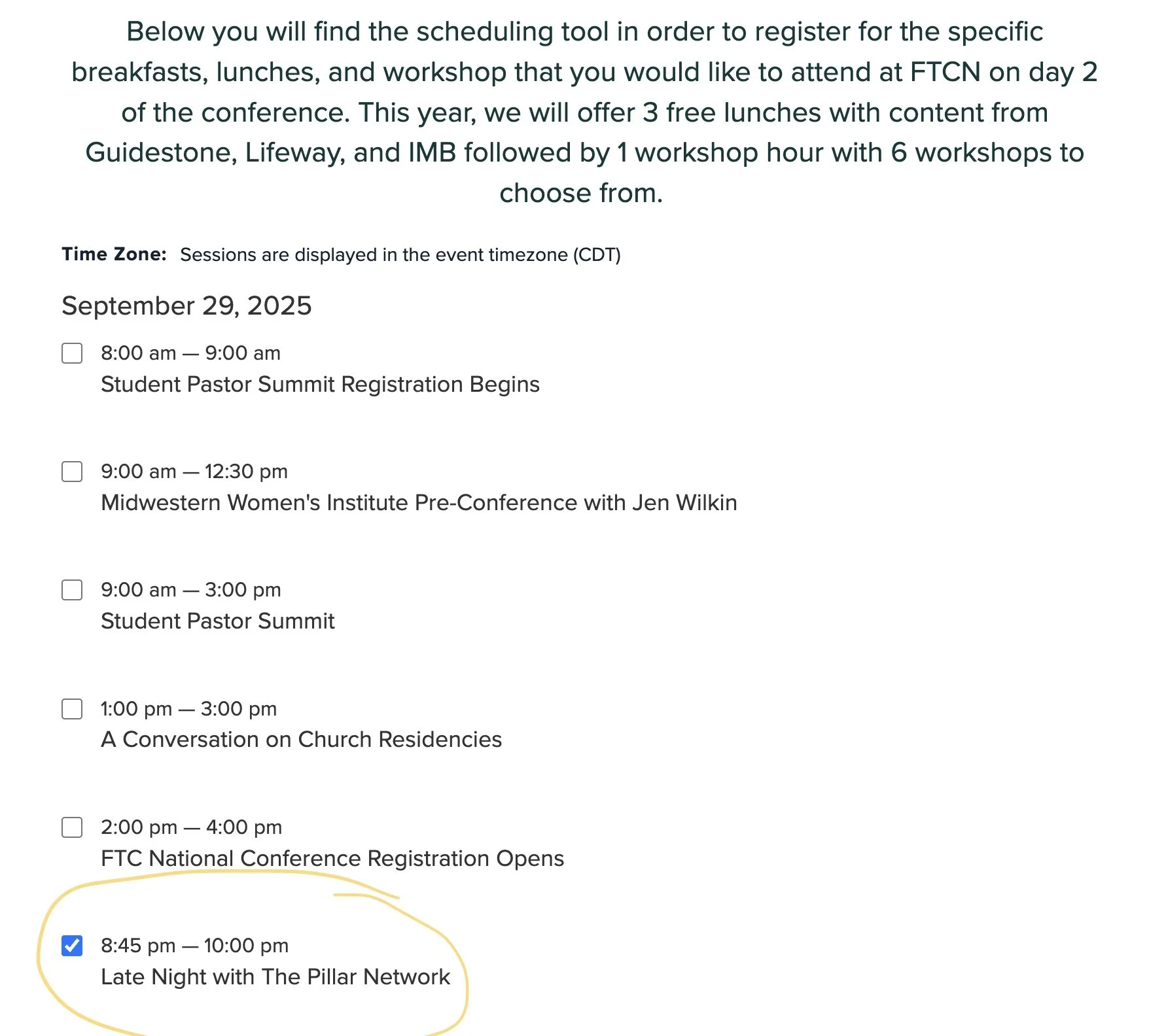 In the “Attendee Profile” section you will see a scheduling tool where you can select add-on events to attend. Look for “Late Night with the Pillar Network” under September 29 and check that box.