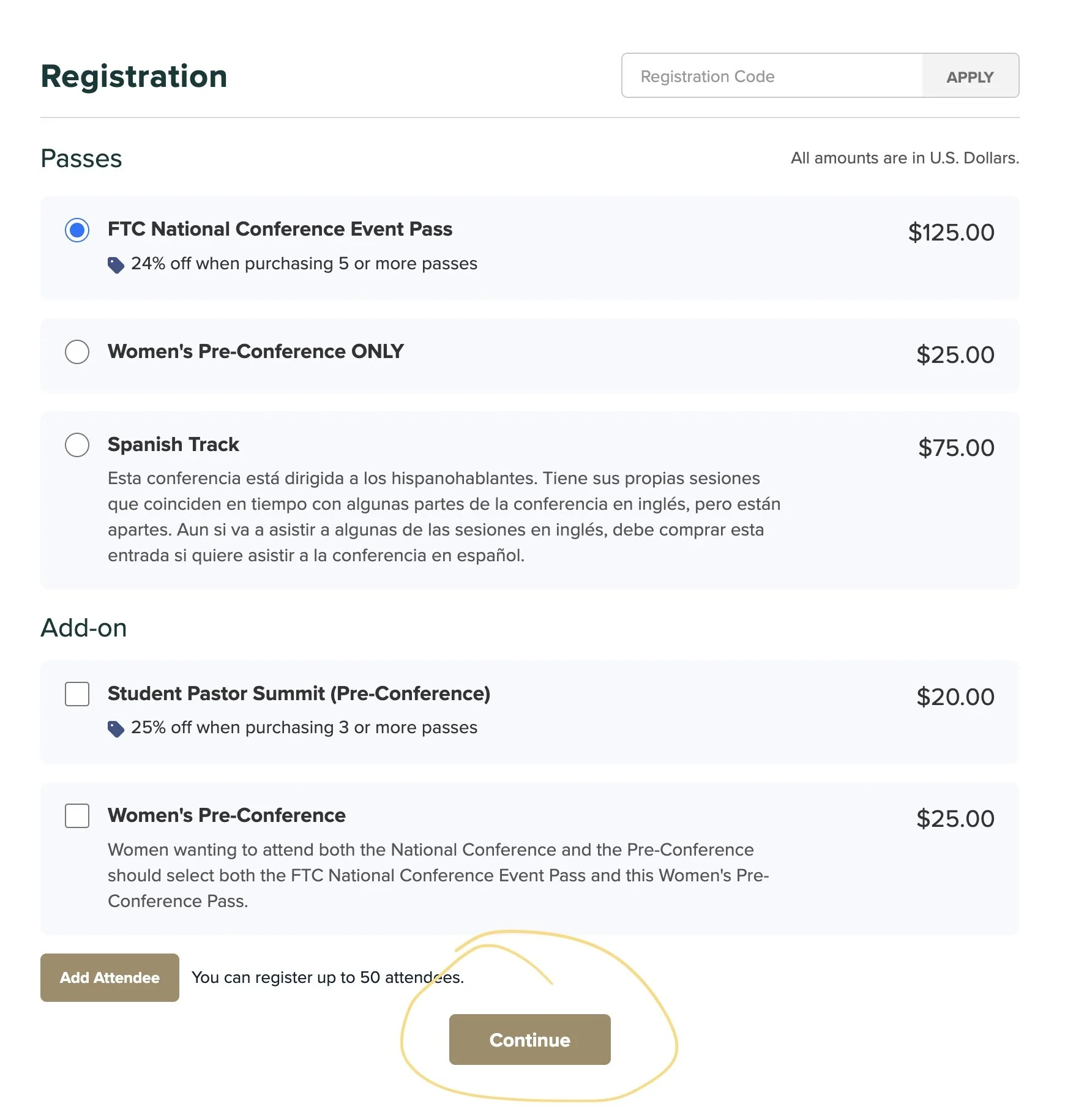 Click ”FTC National Conference Event Pass,” then “Continue.”